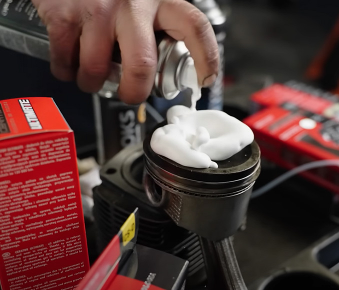 - Sprühen Sie den Aktivschaum mithilfe des mitgelieferten Schlauchs in die Zündkerzenöffnungen, bis diese vollständig gefüllt sind.